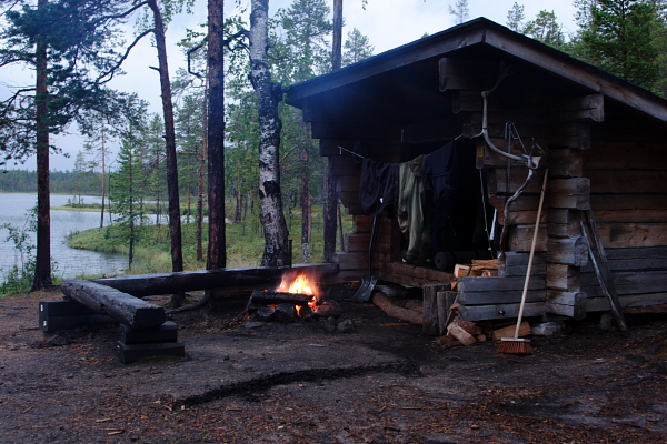 matkaa kohti laavua. Laavulle päästyämme päätimme jäädä siihen yöksi ja kuivatella varusteita nuotion loimussa. Sadekin lakkasi illan aikana. Söimme iltapalan ja sitten laavuun