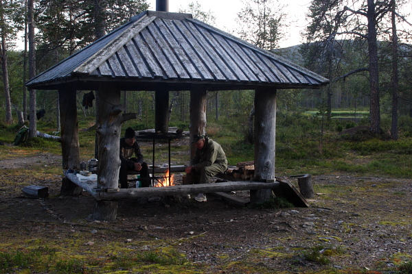 tuvalta hieman etelään olevan keittokatoksen vierestä ja kun teltta oli pystyssä ja iltapala porisemassa, kello näytti vajaata 21. Iltapalaksi laitettiin nuudelia (paketti, jossa maustepussi mukana)