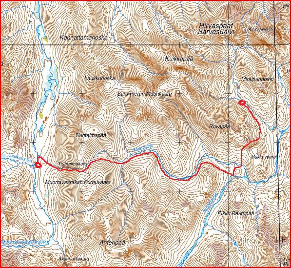 Anterinmukan autiotuvalle. Muutkin (ainakin porot) olivat käyttäneet samaa reittiä, koska saime kävellä hyvää polkua (ei merkitty karttaan) aina Kaarreojalle asti.