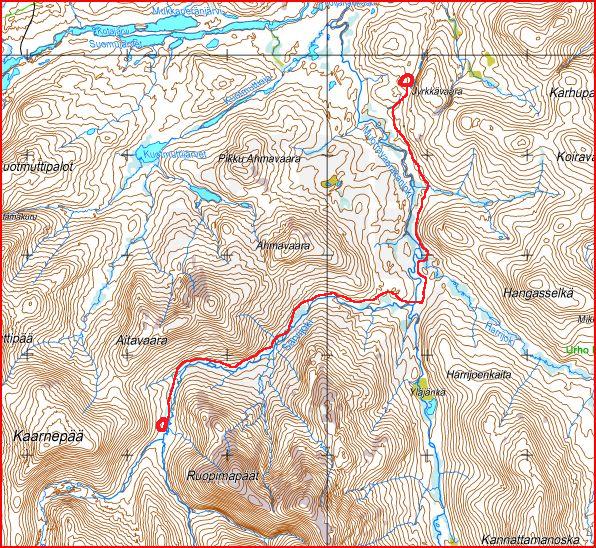 ja sitten Muorravaarakanjoen varren polkua pitkin. Matkan varrella oli kaksi ylitysta: Muorravaarakanjoen ylitimme sen ja Sarvijoen yhtymän kohdalta nuotiopaikan
